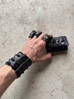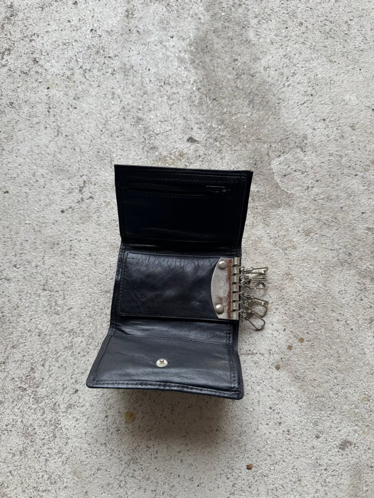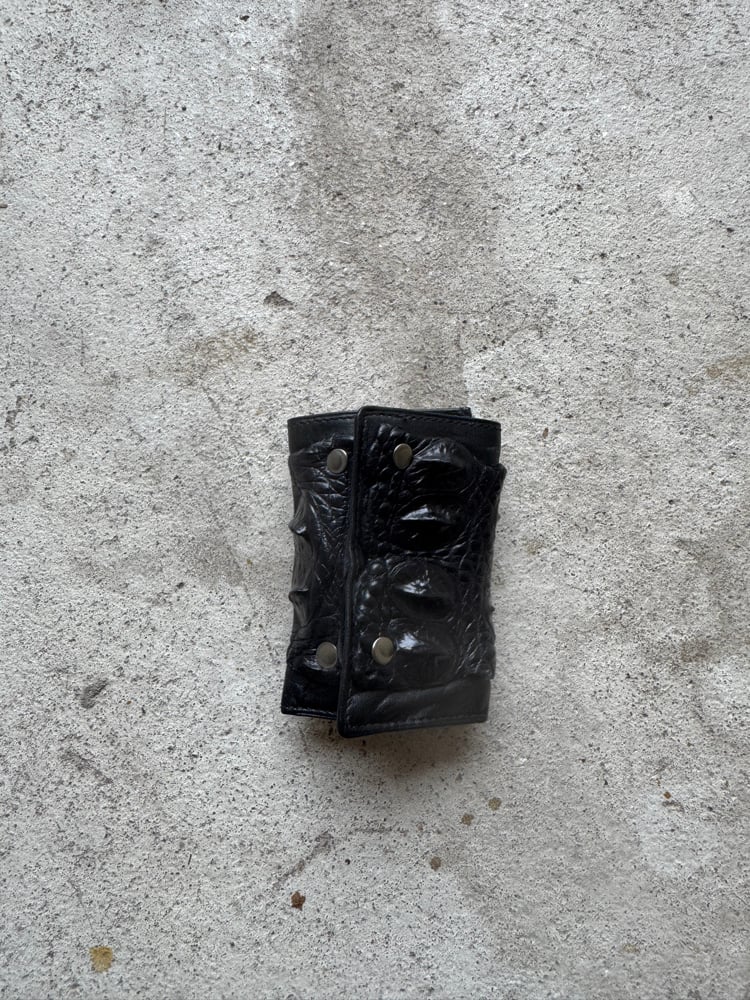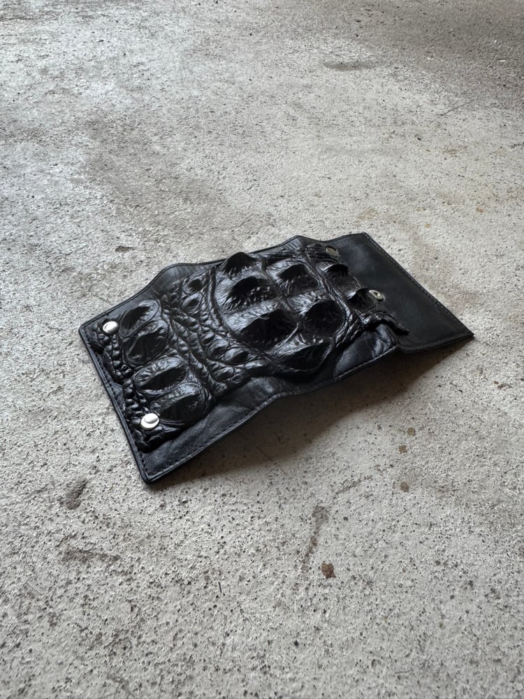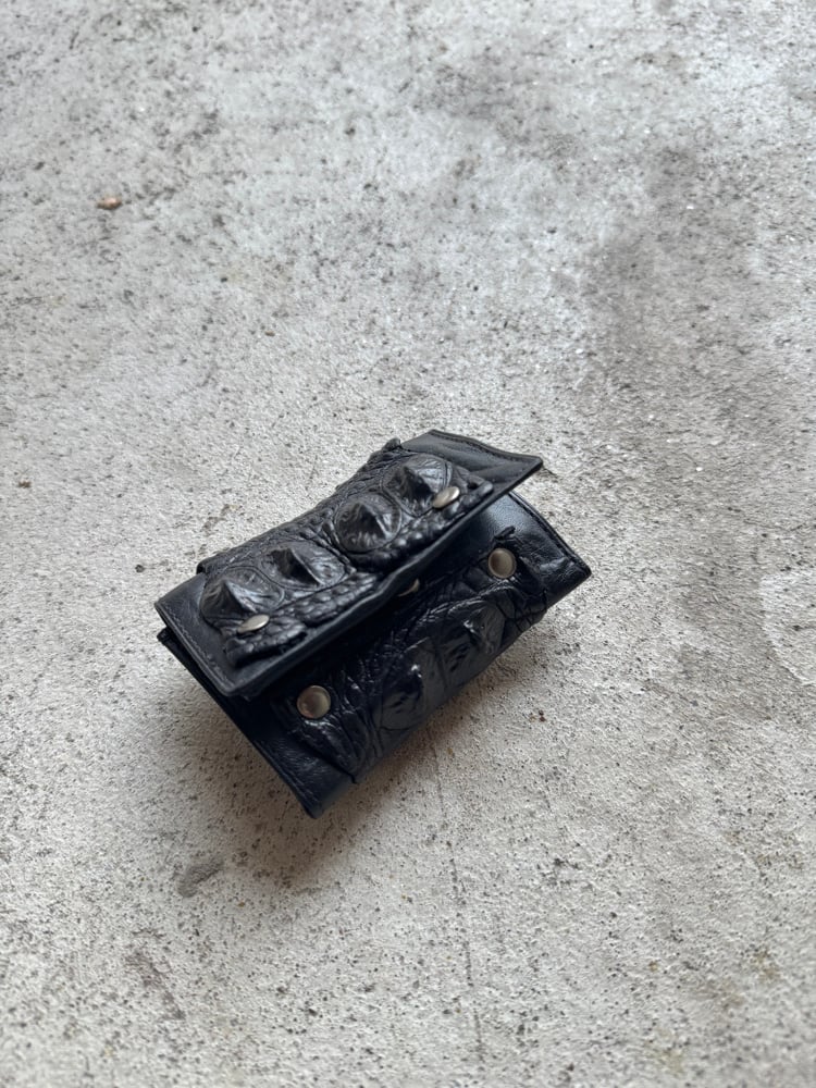 This small handmade leather wallet is made out of genuine leather with crocodile leather details. You can store your cards or cash in the wallet and attach your keys or other items to the metal carabiners.