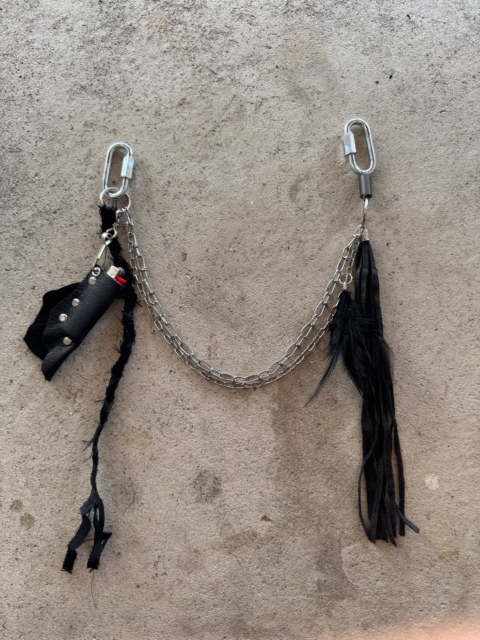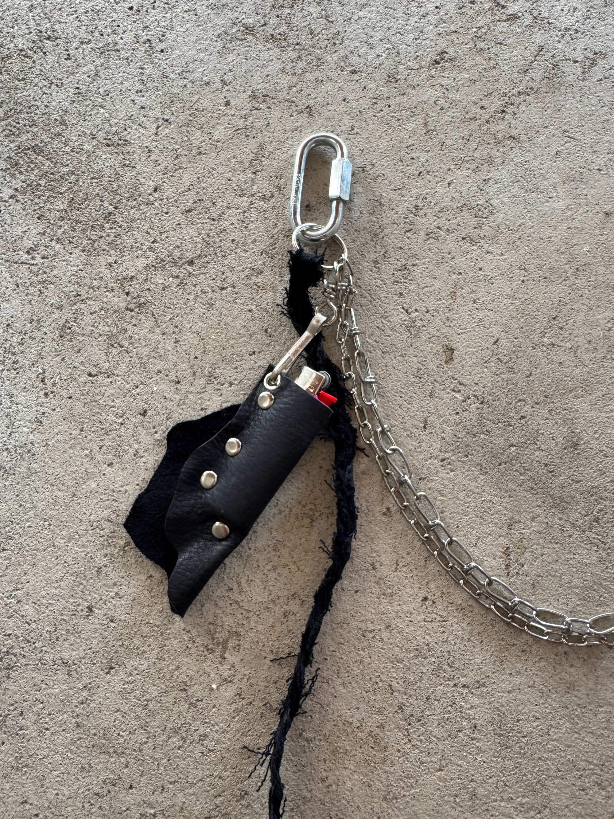 The keychain consists of 2 carabiners and metal chains hanging between them, as well as various eyelets and other metal details. A metal hook hanging down holding a custom leather lightercase. The bic lighter can be changed so the lightercase can be used aswell when the lighter is empty. The chain also features an aluminum pendant and various leather accessories like the Nullum Logo in snakeskin look and a feather.