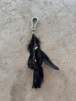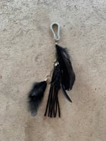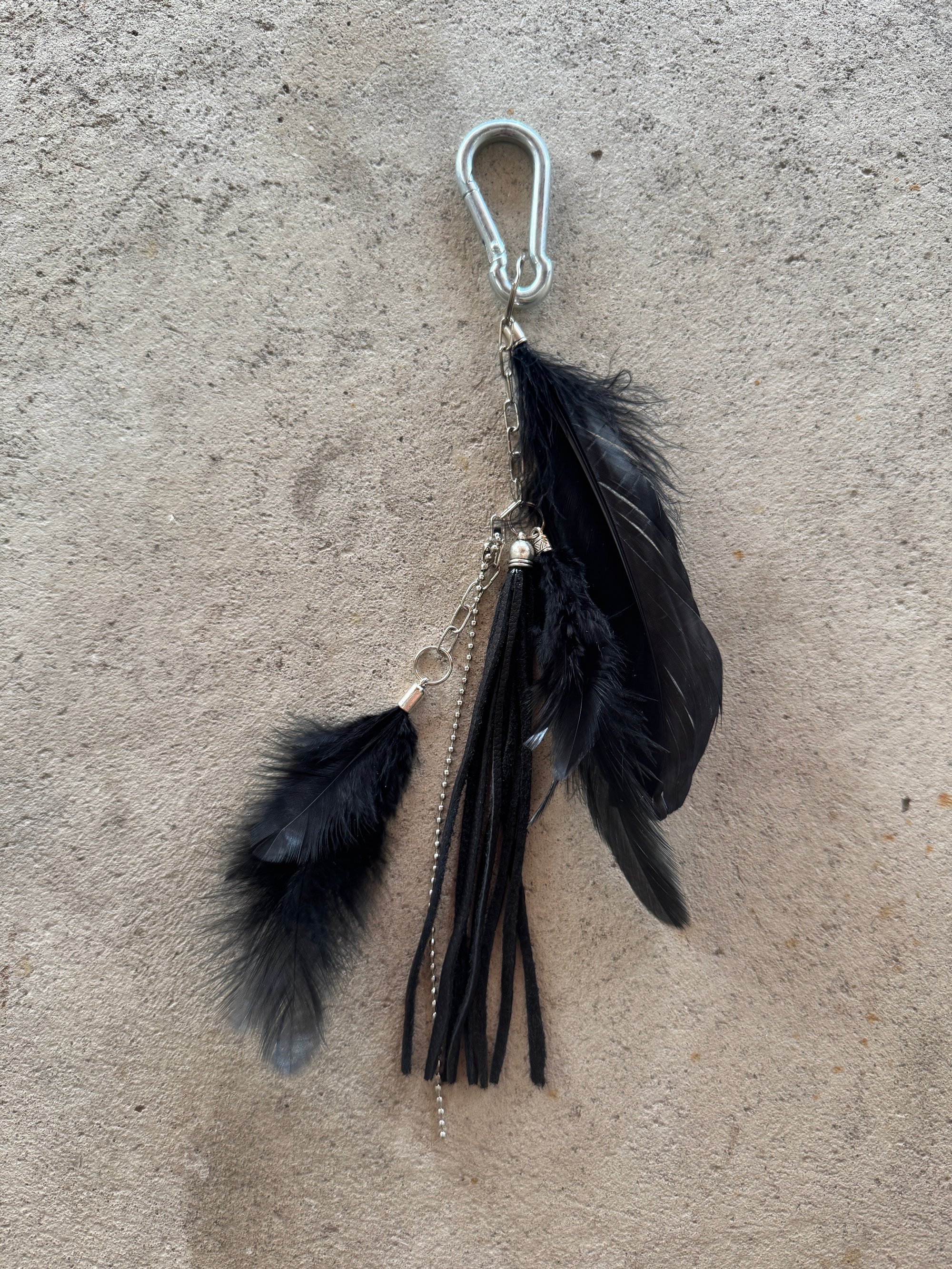 The keychain consists of a carabiner and a metal chain hanging down holding feathers. The charm also features various eyelets and other metal details and different leather and cotton accessories aswell.