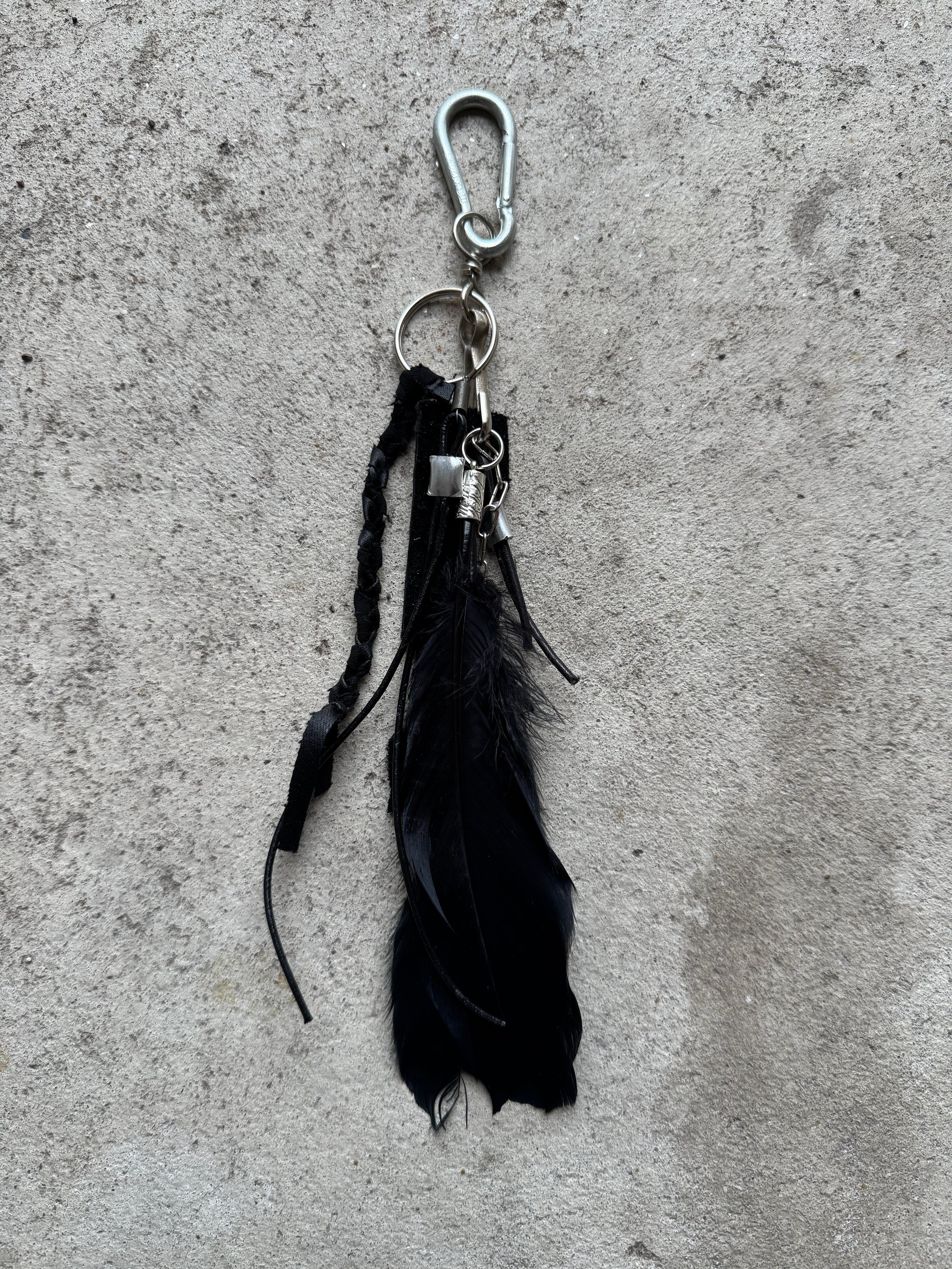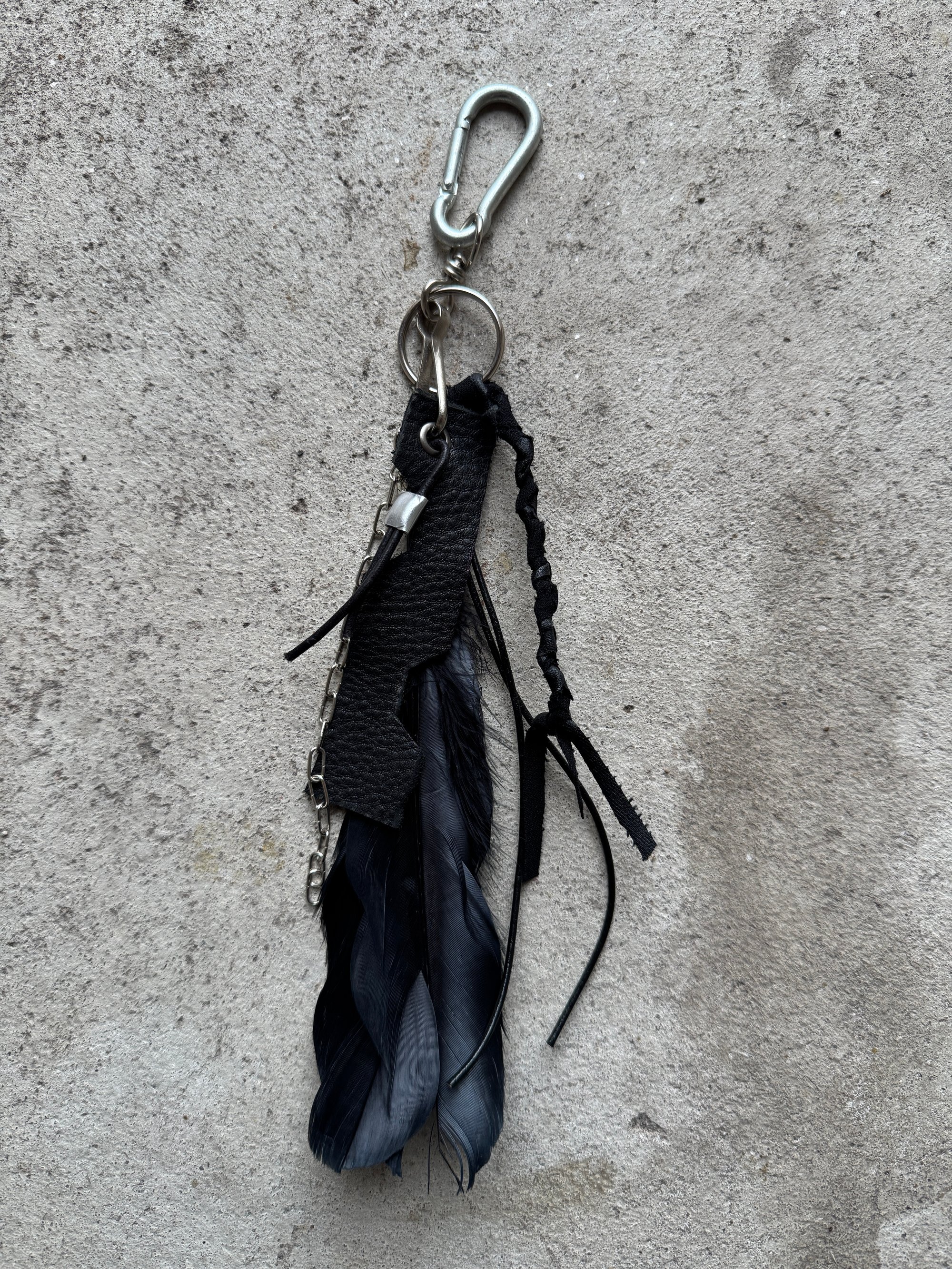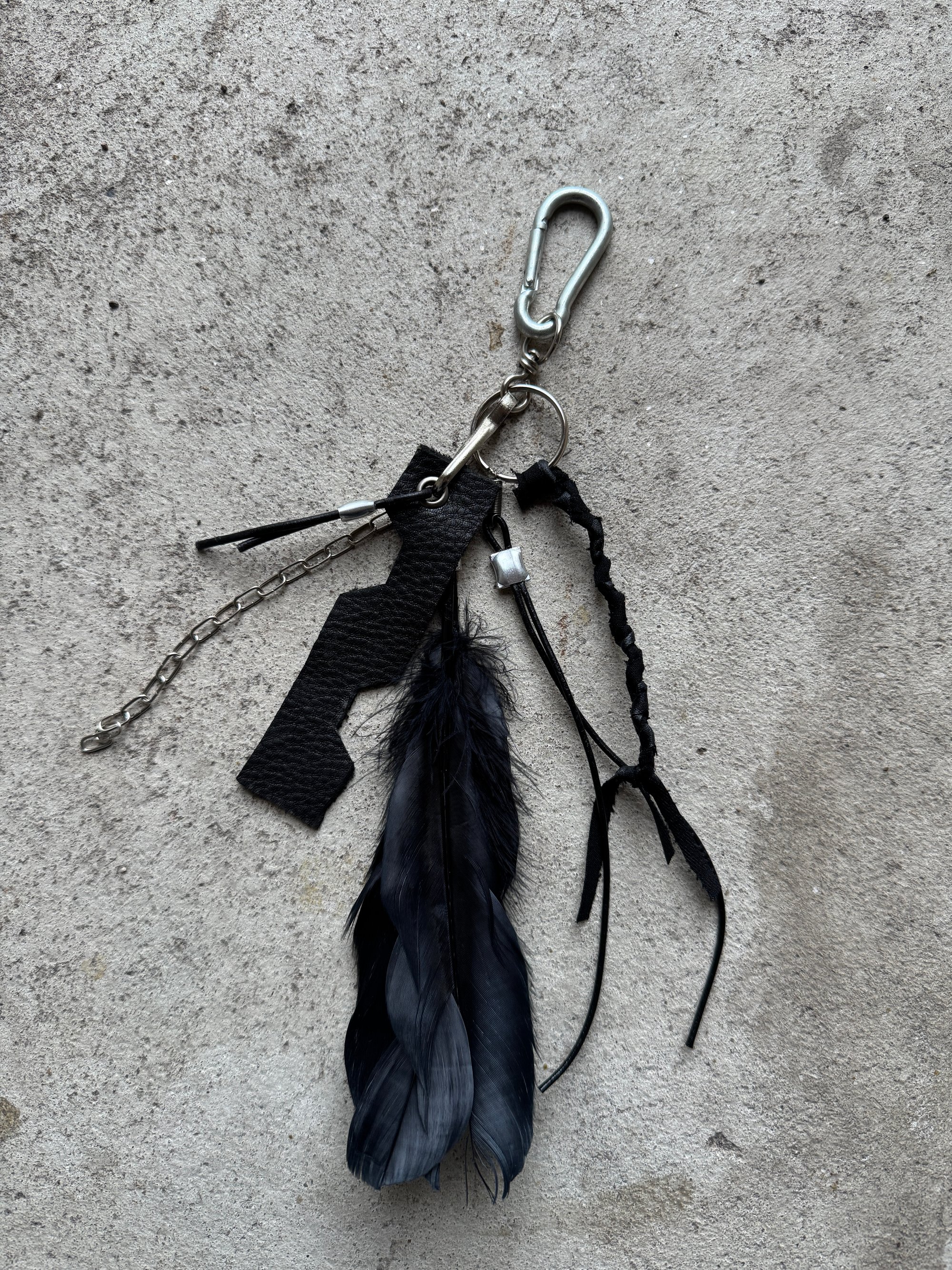 The keychain consists of a carabiner and a metal chain hanging down holding feathers. The charm also features various eyelets and other metal details and different leather and cotton accessories aswell like a Nullum leather Logo.