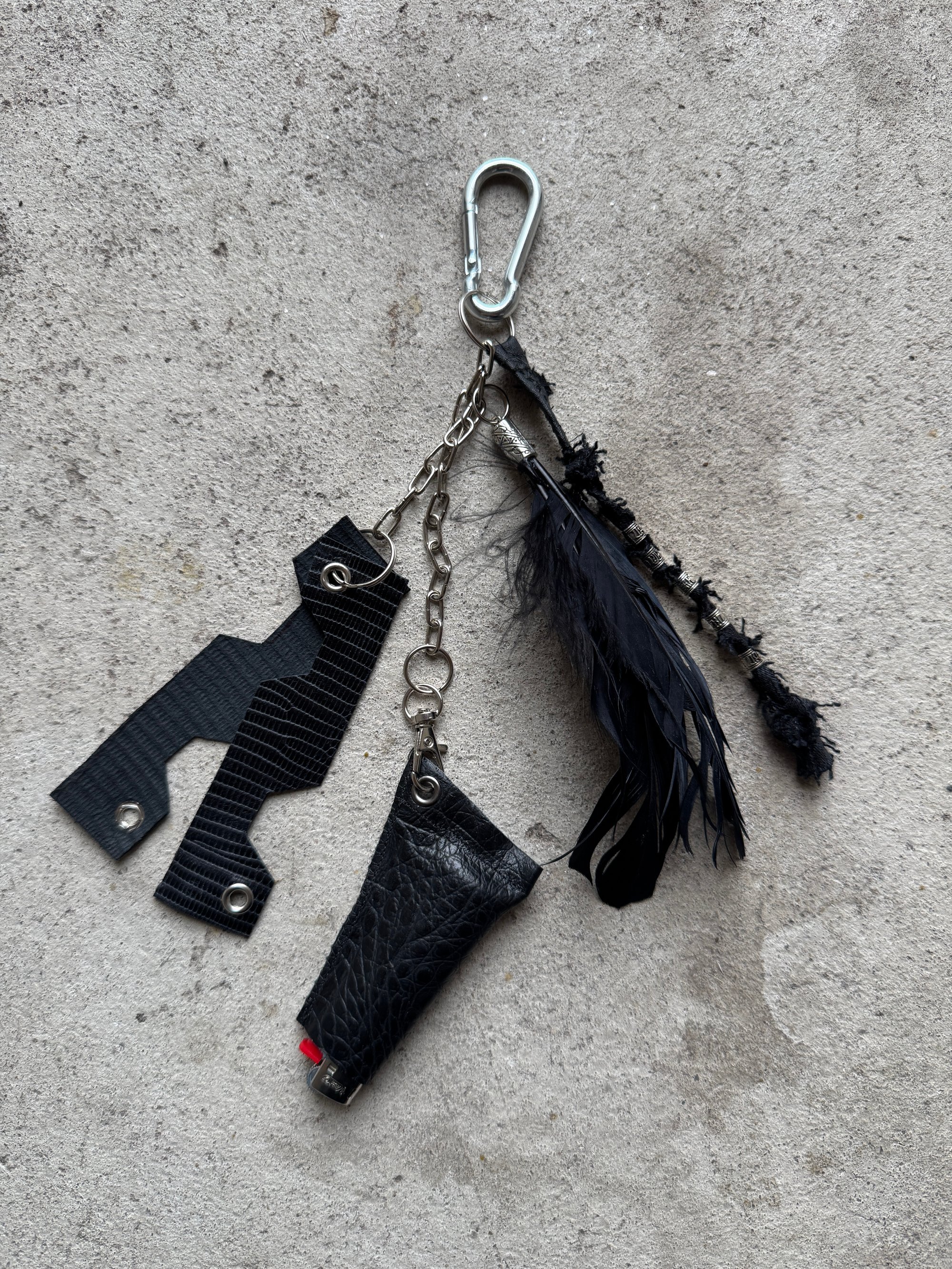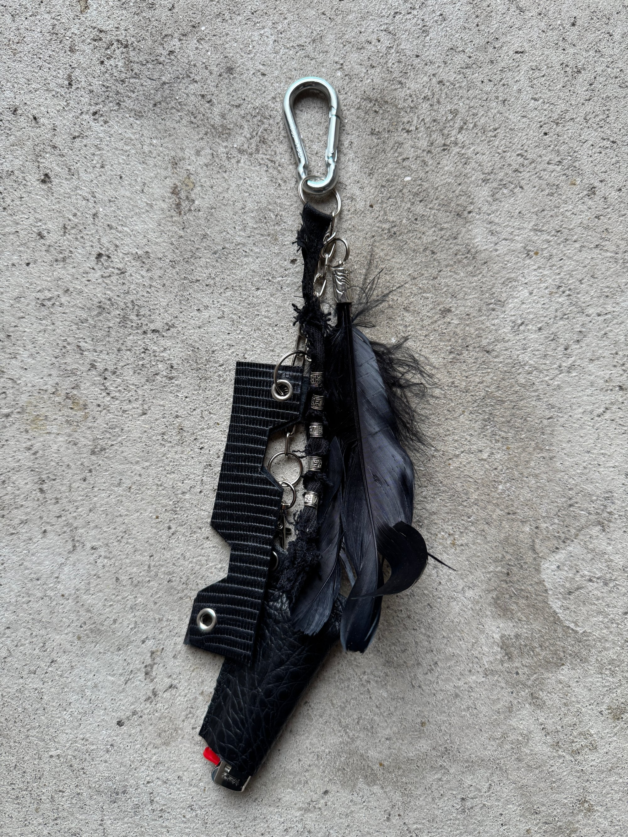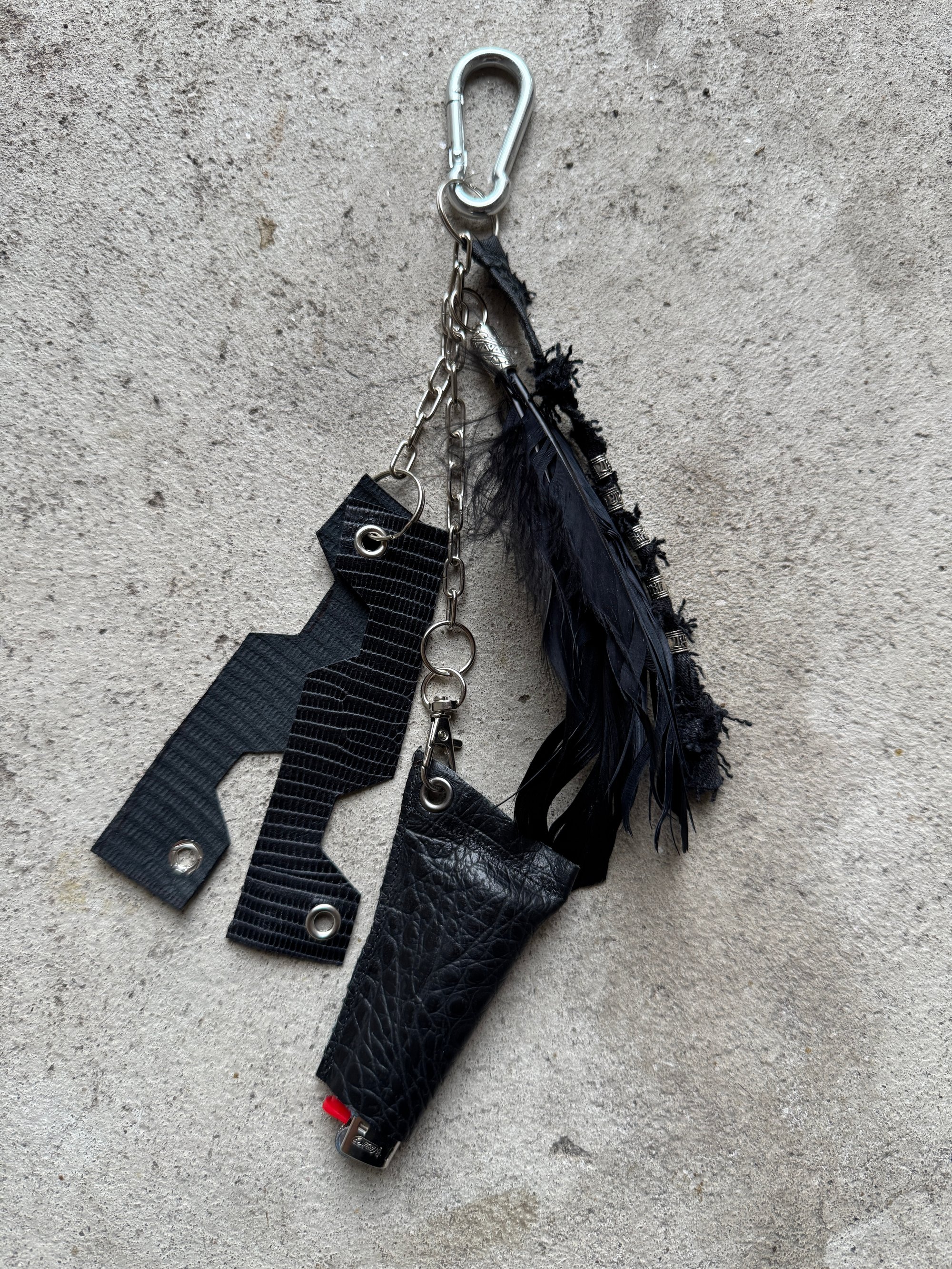 The keychain consists of a carabiner and a metal chain hanging down holding feathers and 2 leather Nullum logos in snakeskin look. The charm also features various eyelets and other metal details and different leather and cotton accessories aswell. Also a metal hook hanging down holding a custom leather lightercase. The bic lighter can be changed so the lightercase can be used aswell when the lighter is empty.
