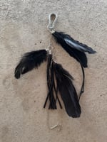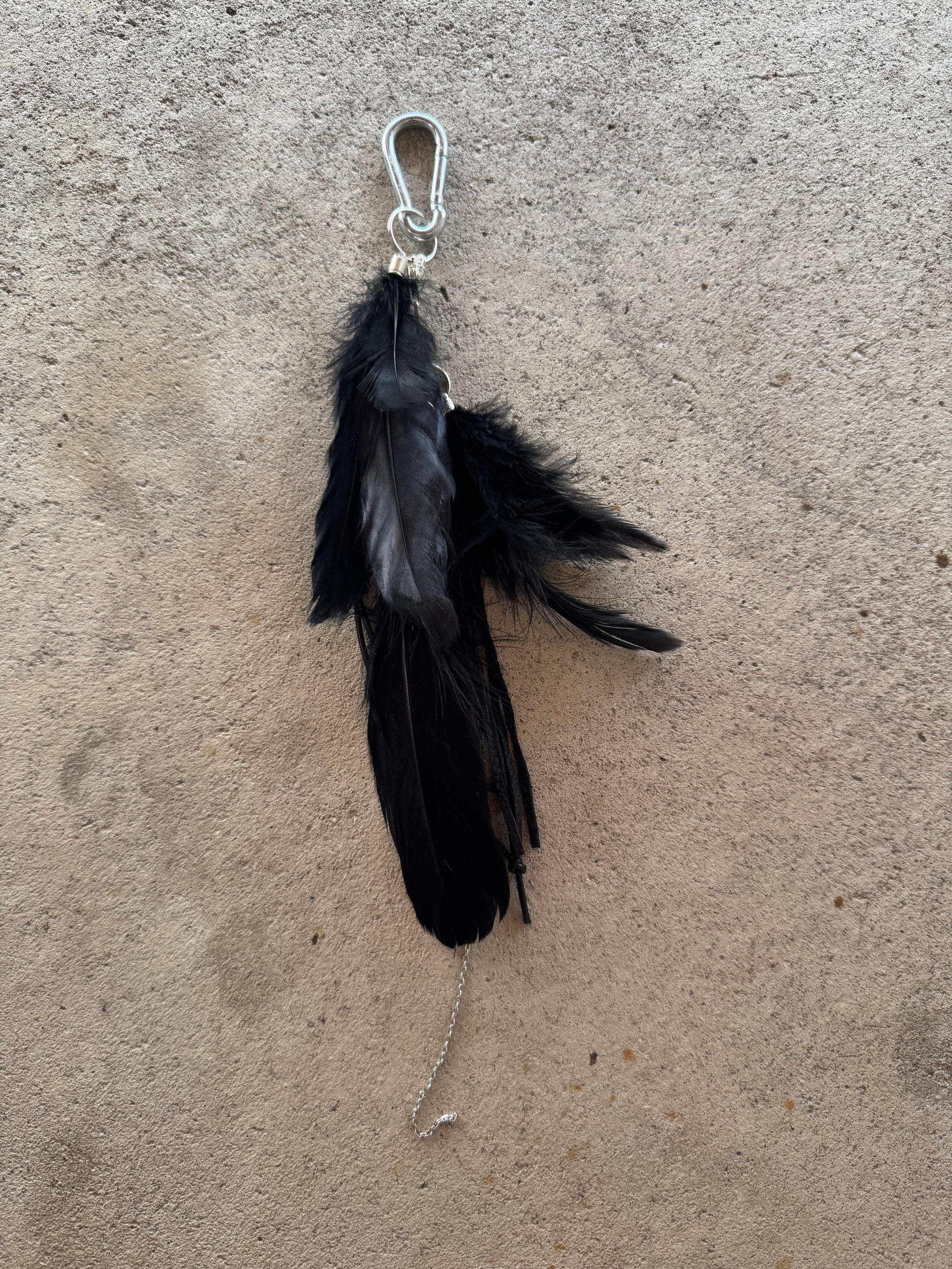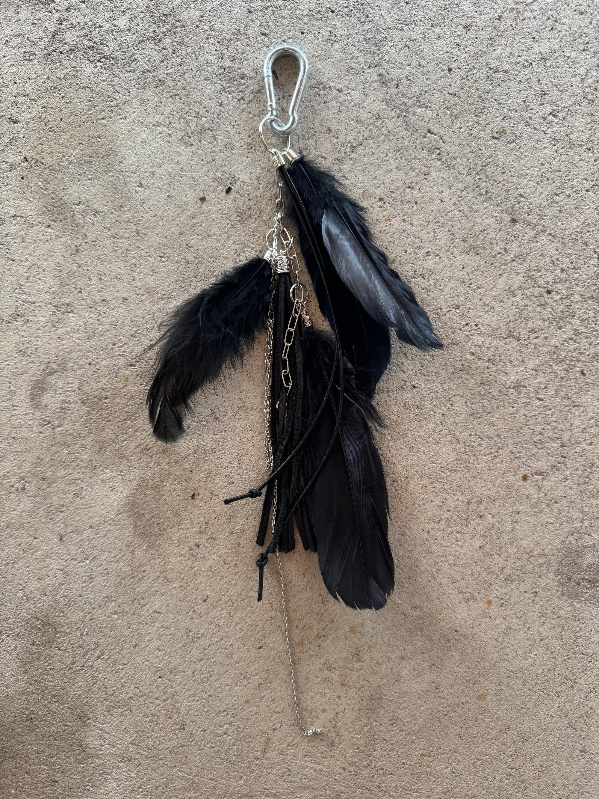 The keychain consists of a carabiner and a metal chain hanging down holding feathers. The charm also features various eyelets and other metal details and different leather and cotton accessories aswell.