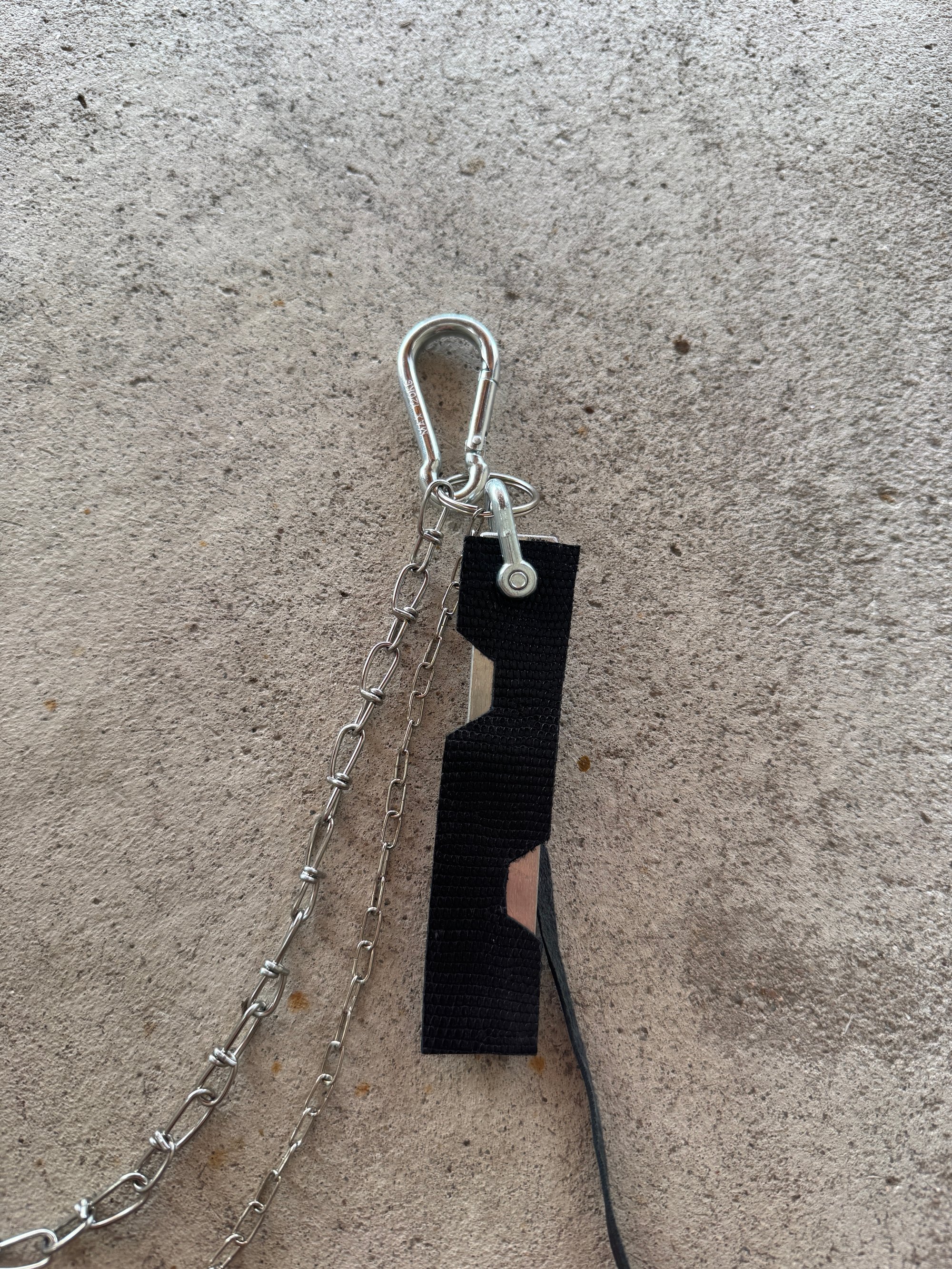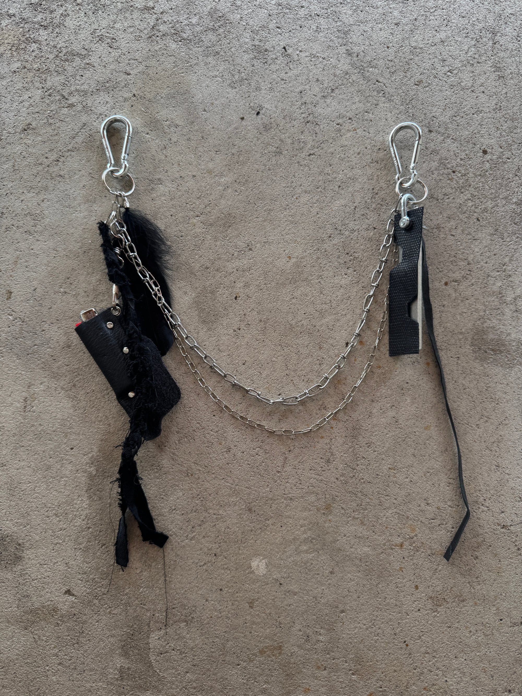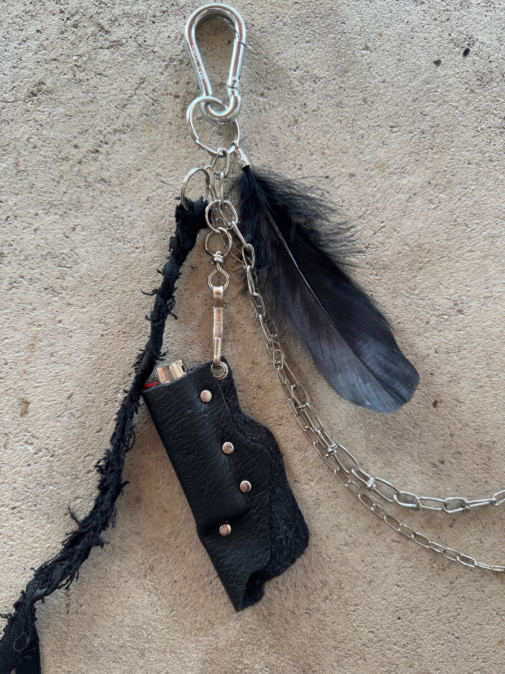 The keychain consists of 2 carabiners and metal chains hanging between them, as well as various eyelets and other metal details. A metal hook hanging down holding a custom leather lightercase. The bic lighter can be changed so the lightercase can be used aswell when the lighter is empty. The chain also features an aluminum pendant and various leather accessories like the Nullum Logo in snakeskin look and a feather.