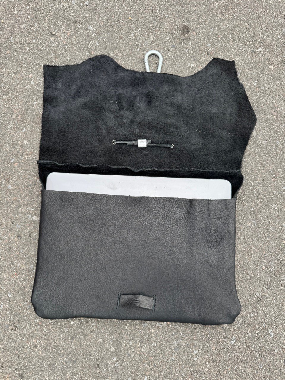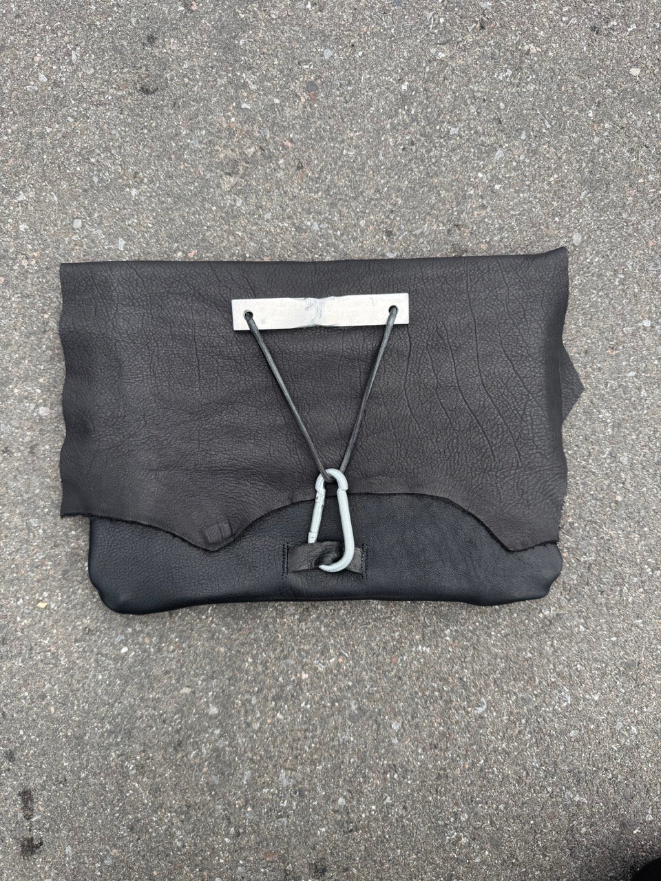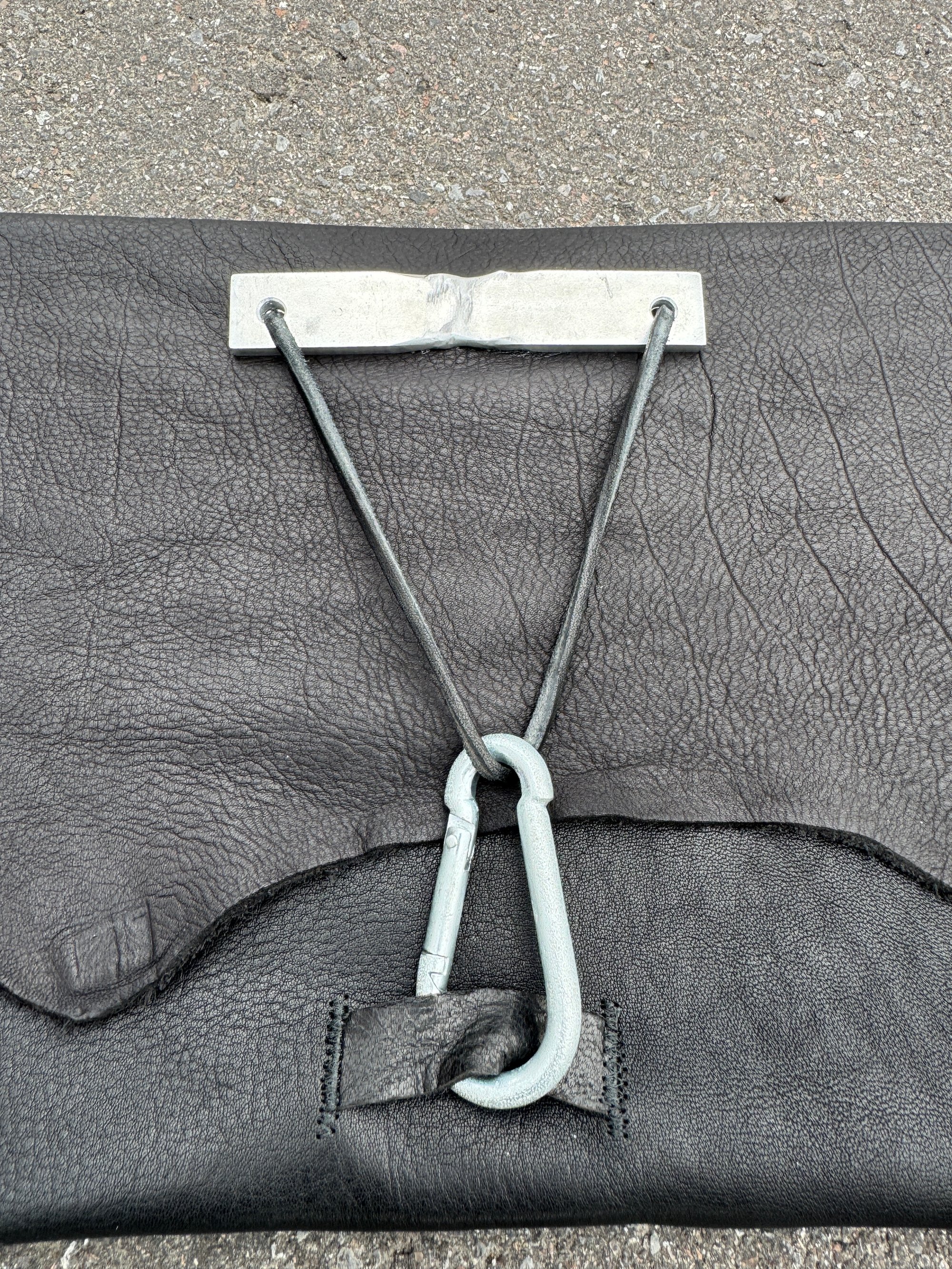 The bag is made of genuine leather, which develops a used look over time. The flap on the front can be closed with a carabiner. The bag features silver details such as a Nullum industrial pendant and a carabiner, and also has a genuine leather strap for the closure.