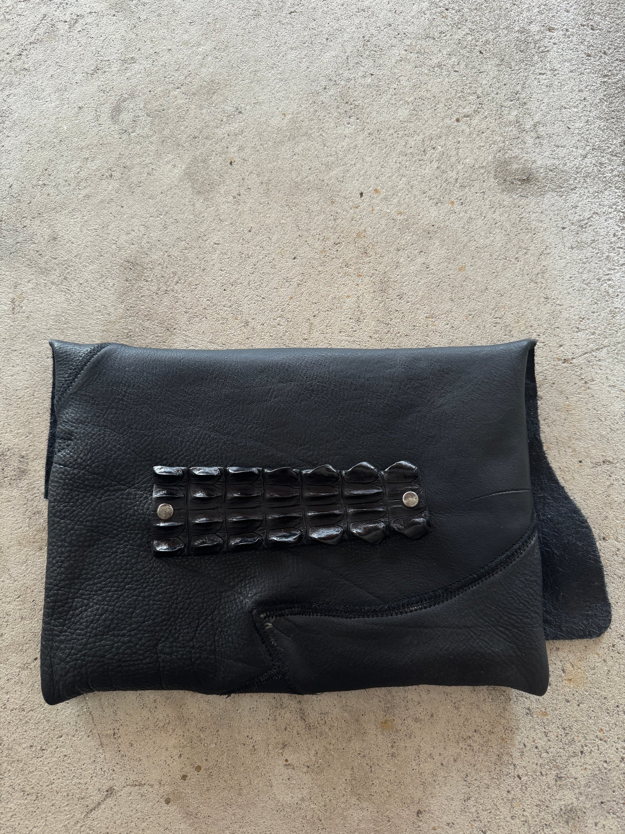 The bag is made of genuine leather scraps, which develops a used look over time. The flap on the front can be closed with a steel ring spring snap made in Germany.